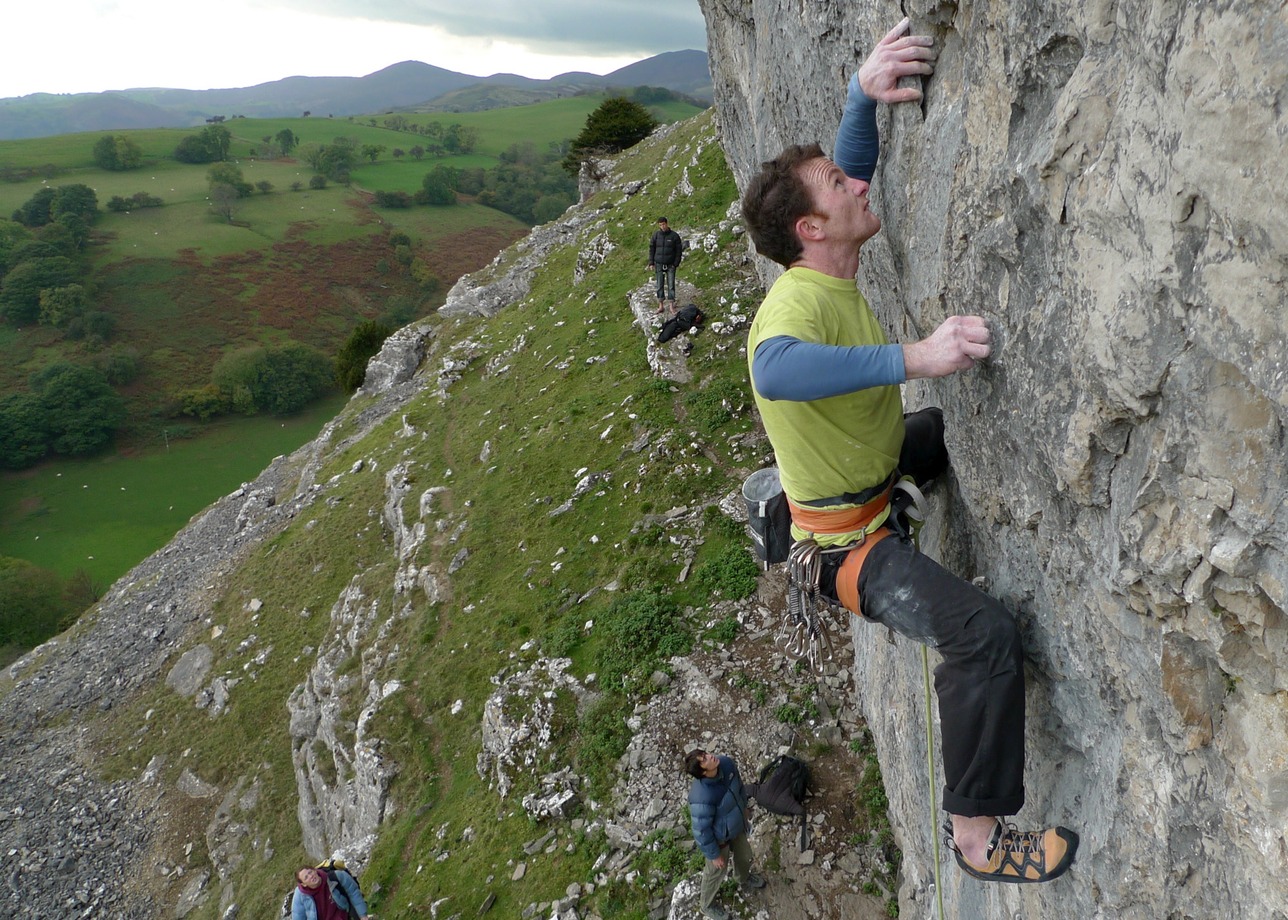 The Welsh limestone crags of Dinbren, overlooking Llangollen, offer somewhere in the region of 160 routes on walls of grey, compact rock with an aspect of possibly unmatched beauty, anywhere else in the UK.