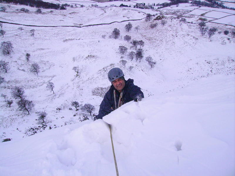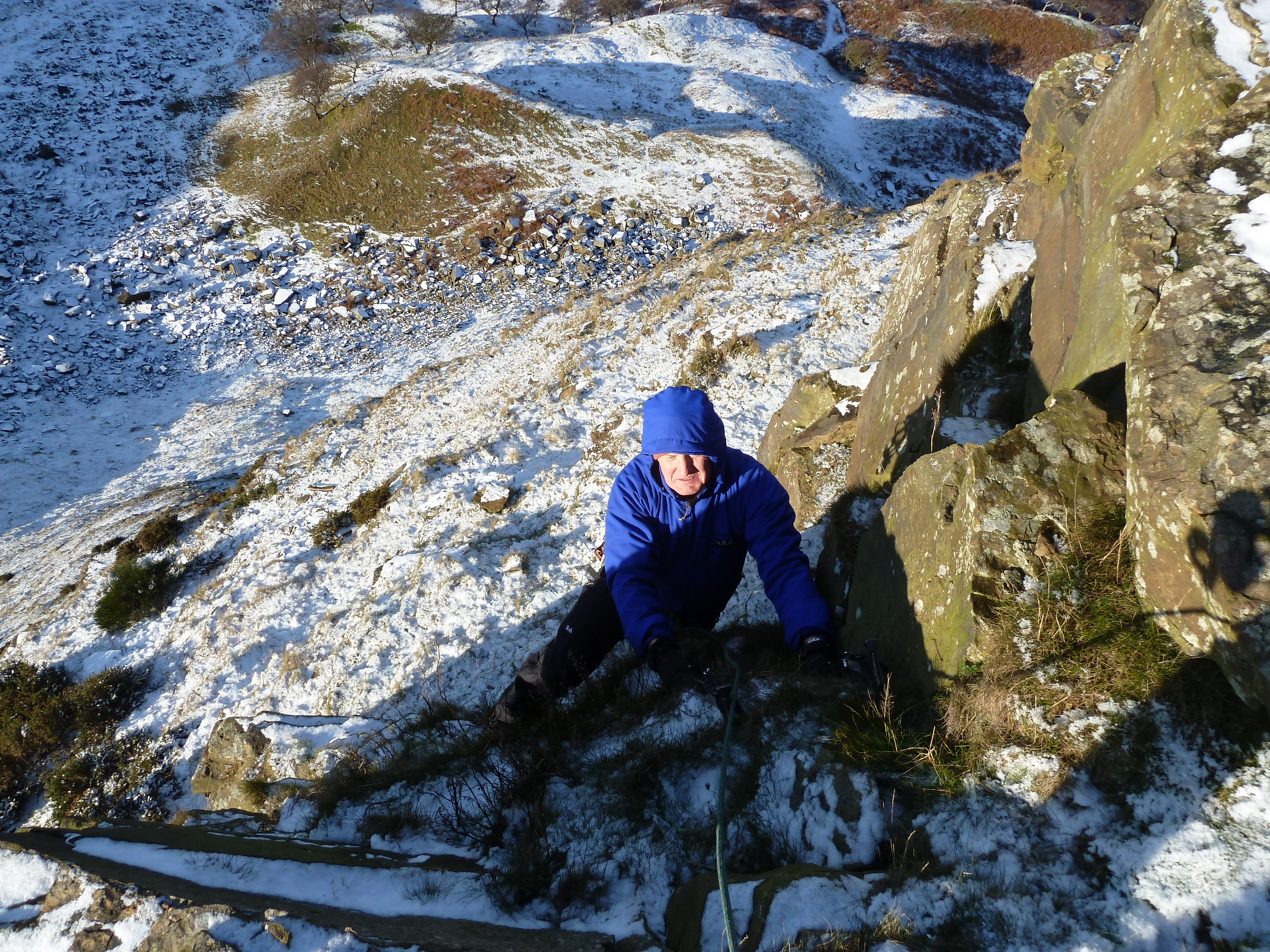The crag was sheltered from the biting wind and we started at the left hand side and the chased the shade rightwards, as the sun was stripping the smattering of snow very quickly. There are no named routes as you can climb anywhere on the whole crag with nothing harder than III 4. The routes are 50m and you can make them as easy or as hard as you like as it’s often short steep steps with easier sections. Much of the rock is loose, but sections do offer good rock protection, leave the ice screws at home. So next time you feel that you need an easy day or don’t fancy the crowds at The Downfall then Back Tor may well be your answer. Let’s hope the freeze continues.