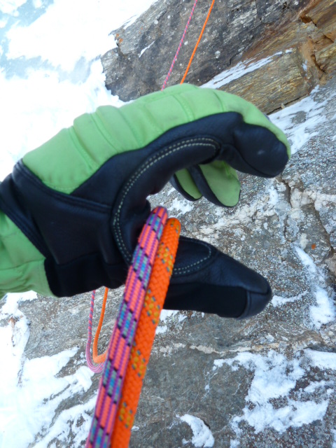 The gloves are the mark 3 2011 gloves, they came in a ‘non conspicuous’ Lime Green, but also come in Black for those of you who prefer to be more discreet. The outer is made from Black Diamonds own BDry waterproof insert, which proved as effective as GoreTex or Event, this was topped with an tough, abrasion resistant shell. The palms and work areas are made from goat leather and featured a double layer around the high wearing Thenar region (that meaty area at the base of your thumb). This was great for all kinds of rope work and gripping my axes, I have in the past worn gloves out in this region, especially on multiple abs when the gloves are wet. The leather also was capped around the fingertips for added durability. I have used the gloves for abs, belaying and even mixed climbing all winter and they have shown no signs of wear. They should easily last another season or two.
