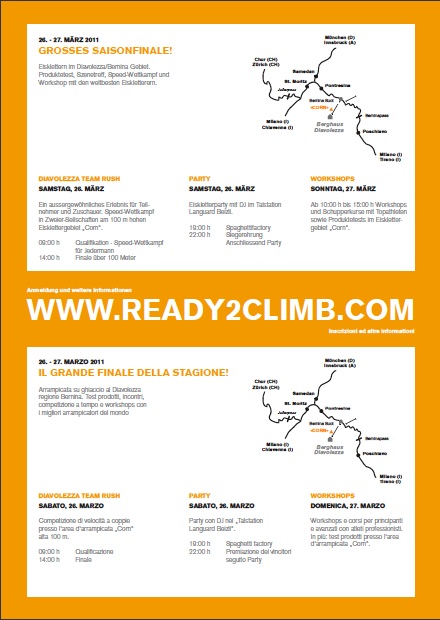 In case of bad weather, the competition and workshops will be completely canceled. We decide on Wednesday, March 23rd 2011. The ice party takes place on Saturday night, in the “Talstation Languard Beizli” in Pontresina with a pasta dinner and a DJ for the music act; we‘ll celebrate anyway!
