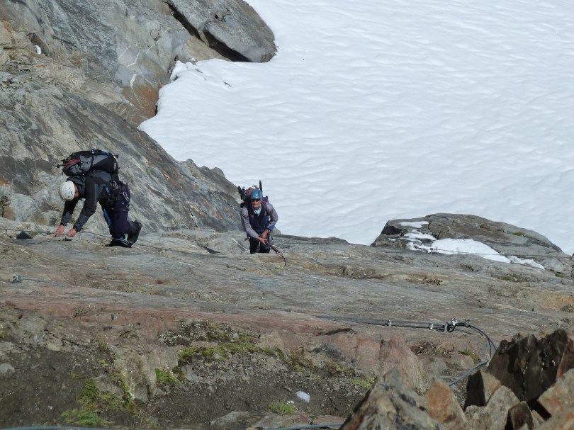 Day 5 – on my trip the weather crapped out here and we went back to the cable car to pick up the Stubaier Honenweg (the famous lower level route) at the Dresdeer Hütte where we still had time to climb two fantastic 250m Via Ferratas. Next day we then double hopped over to Sulzenauhutte for lunch then onto the Nurnberger Hütte. The tour proper makes for the Pfaffejoch (3208m) via some tricky manouvres to gain the Pfaffenferner, then make for the Wilder Pfaff (3456m), the high point of the tour, traversing the ridge EES to hit the Mullerhütte (3145m). It looks a great day and it was a real disappointment to not have done it. On the plus side it’s a great reason to do the tour again!