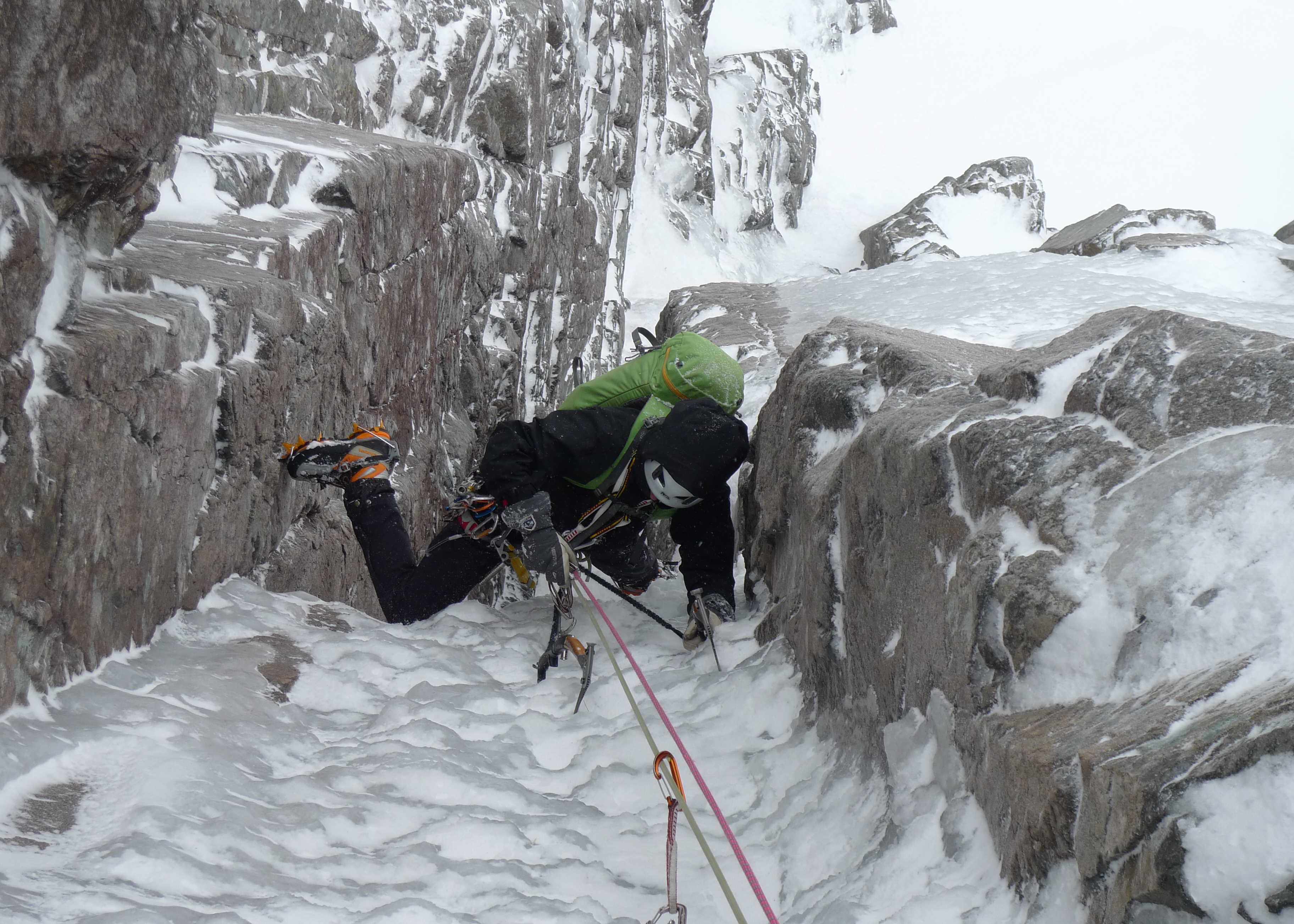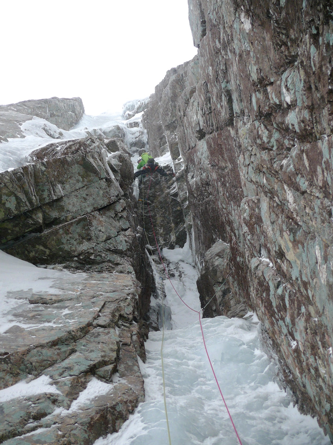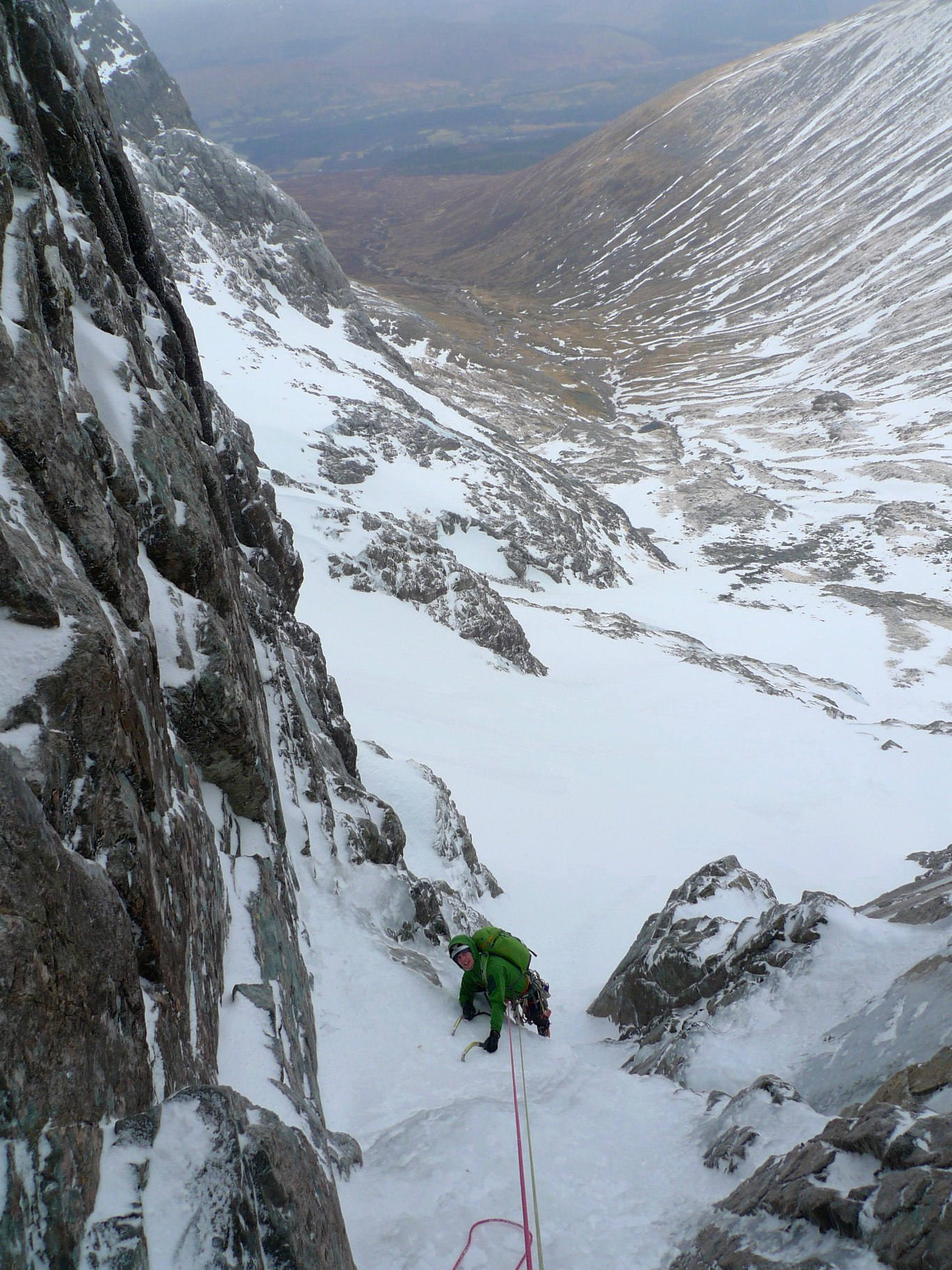 P1: Rich led off up good consolidated snow to a nice ice step (good screw runners) which paved the way into the gully above and a further ice step and steepening. Belaying at the base of this on a good crack on the right wall containing an old insitu wallnut 10, tied off with blue tat and a Camalot 0.5, he brought me up. This is a good solid belay with a decent view of the next pitch, but also out of the main frag line.