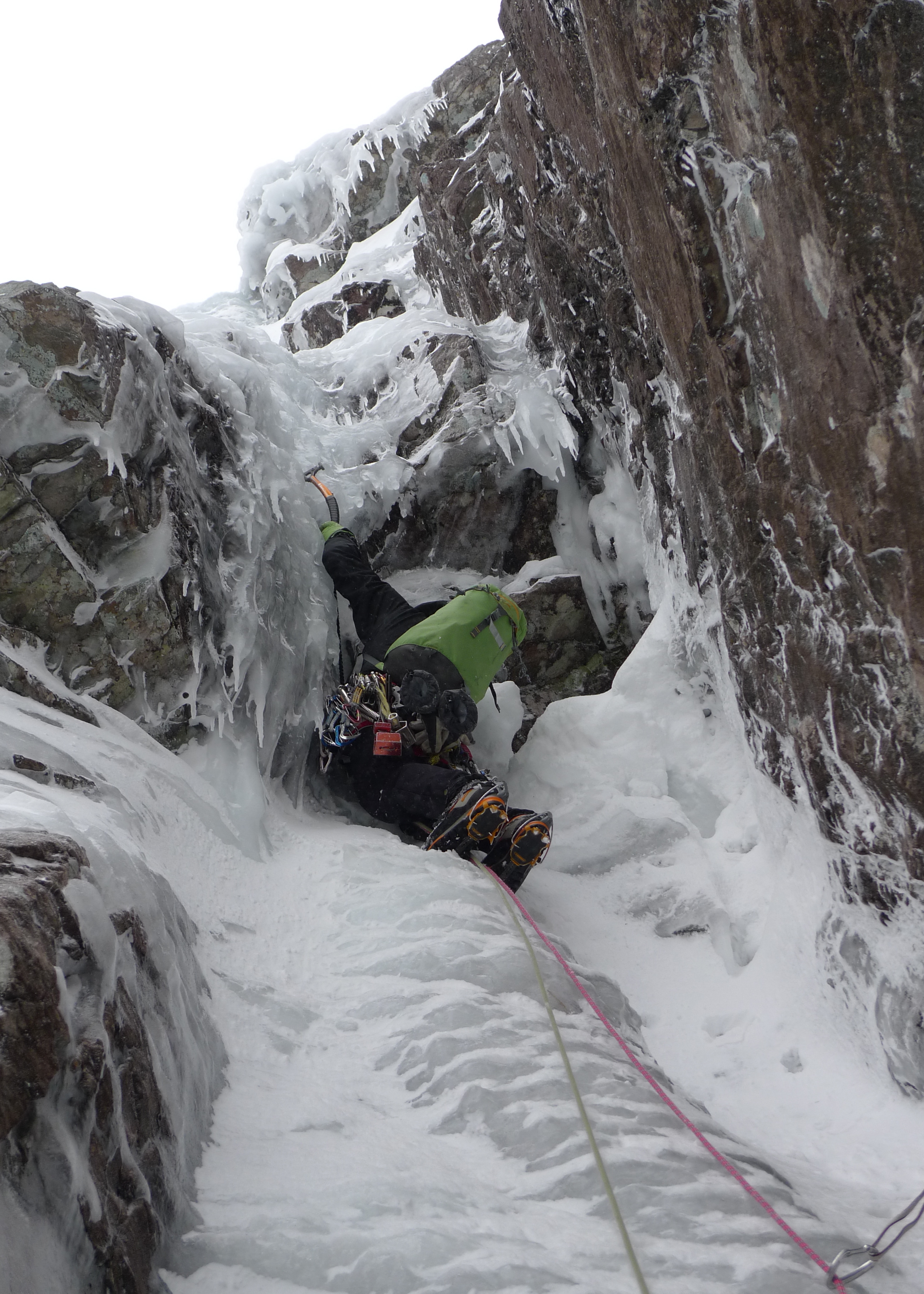 P4: The guidebook says that either groove can be followed. I opted for the lefthand one. Spookily thin ice at the bottom, had me searching for runners in the rocks on the left. I found a couple of satisfactory nuts and quested on up. Getting committed on 75-80 degree, inch thick ice, I kept teetering upwards, no going down or so it felt. The 50 foot runout, occasional ‘ice losing contact and showing me rock’ and general seriousness, made this section feel pretty engaging! Better neve and a good nut a little higher, made things more enjoyable and had a hint of Chamonix goulotte climbing about them. I belayed on pegs (not insitu) and an ice screw, after approximately 45 metres and brought Rich up.