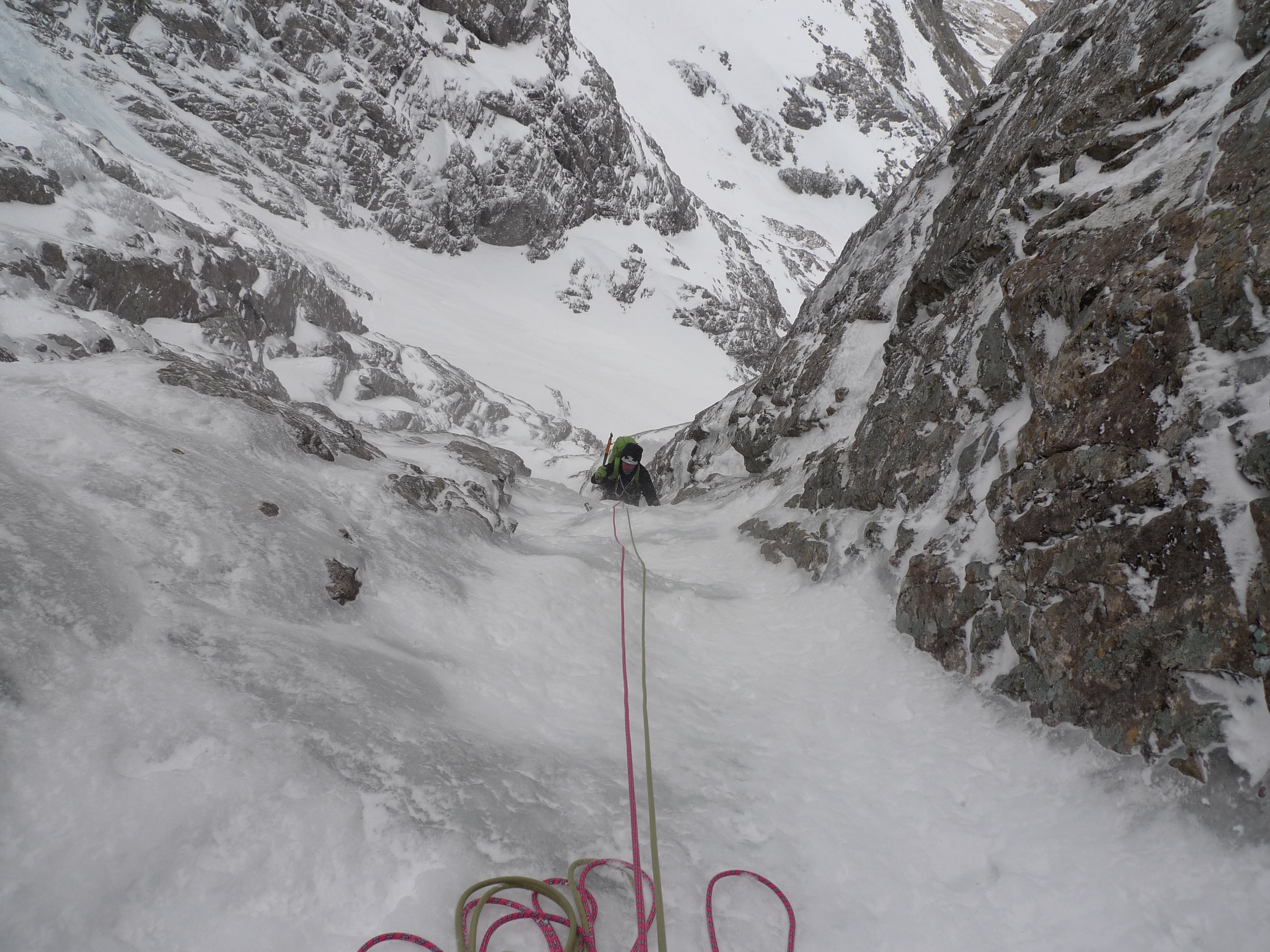 As the snow slope narrows to form a gully with a rock wall on either side we chose to belay. A ledge kicked out of the snow. A peg (not insitu) hammered into a thin crack on the right and the axes buried to the hilt and clipped.