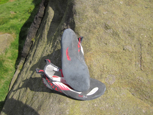 So that’s the fit and the materials so how about the performance? The Red Chili Nacho is marketed as a bouldering shoe and that’s how I’ve used them most of the time. I’ve used them at Malham and Kilnsey, I felt they performed a little better on the steeper routes at Kilnsey. They edged OK at Malham but my feet got tired after a couple of routes in them. Now to the bouldering, for this activity they excelled the fit was great for gritsone and the 4.5mm RX-2 rubber sole was very grippy. The thickness and duarability are just right, I have been using them for several months now and the shoes still have a good edge.