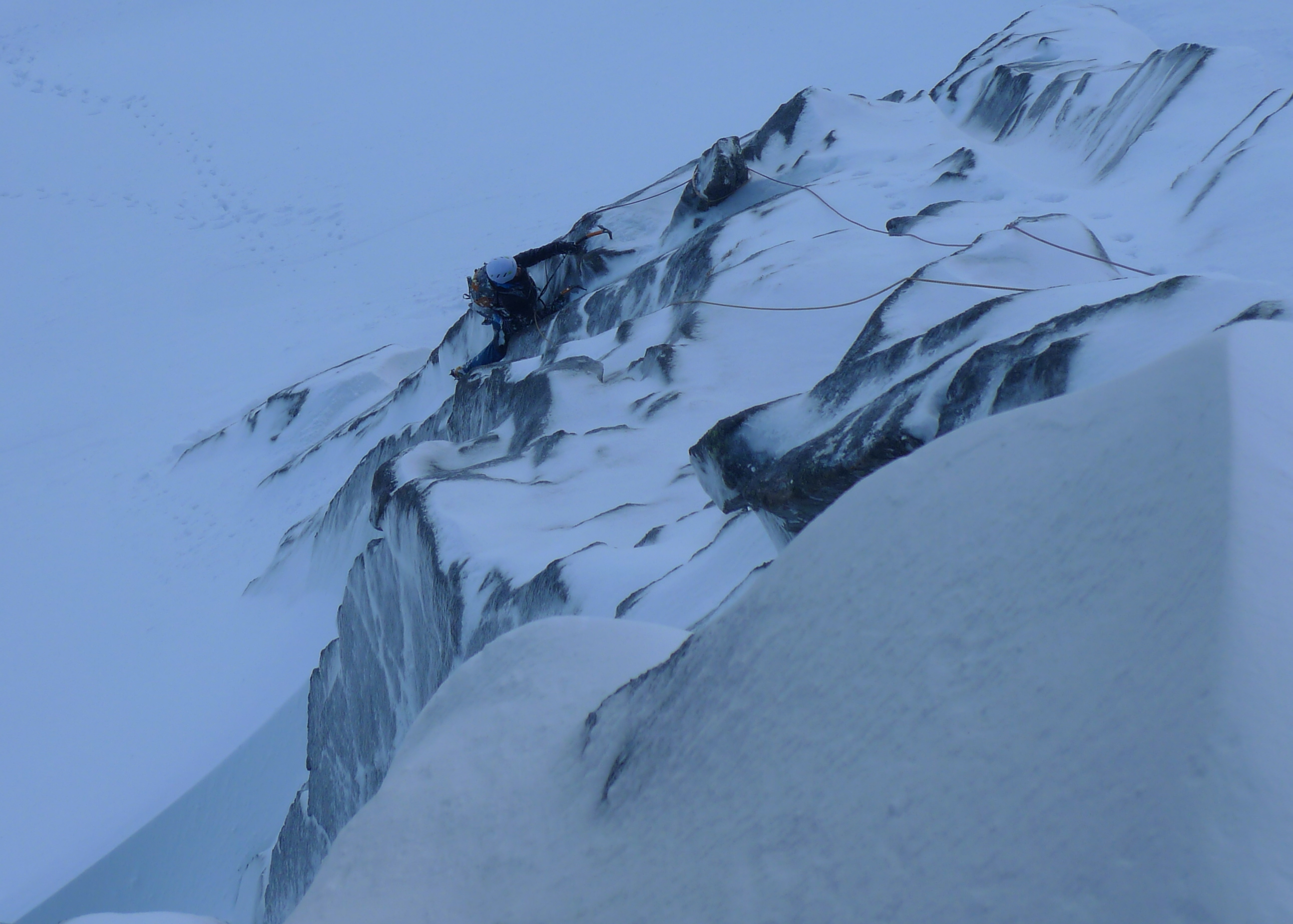 There were some pockets of wind slab on the approach slopes and care will be needed after all the new snow and wind. We opted to climb Original Summer Route IV, 5 and this gave some good climbing and a little bit of respite from the wind. It also offered a safe abseil descent. Other teams were out on Doctor’s Choice, Patey’s Route, Invernookie and The Seam.