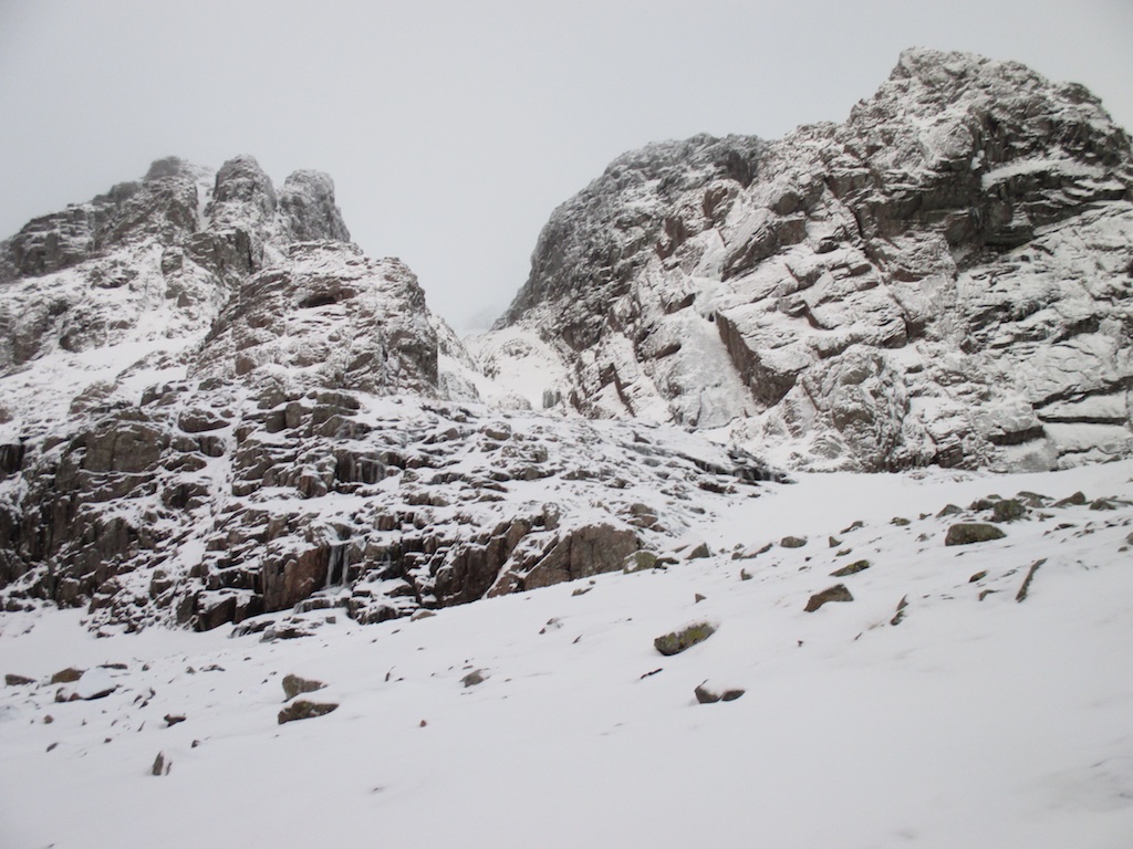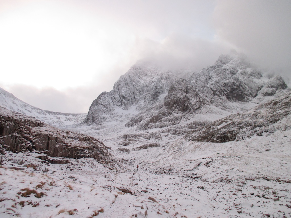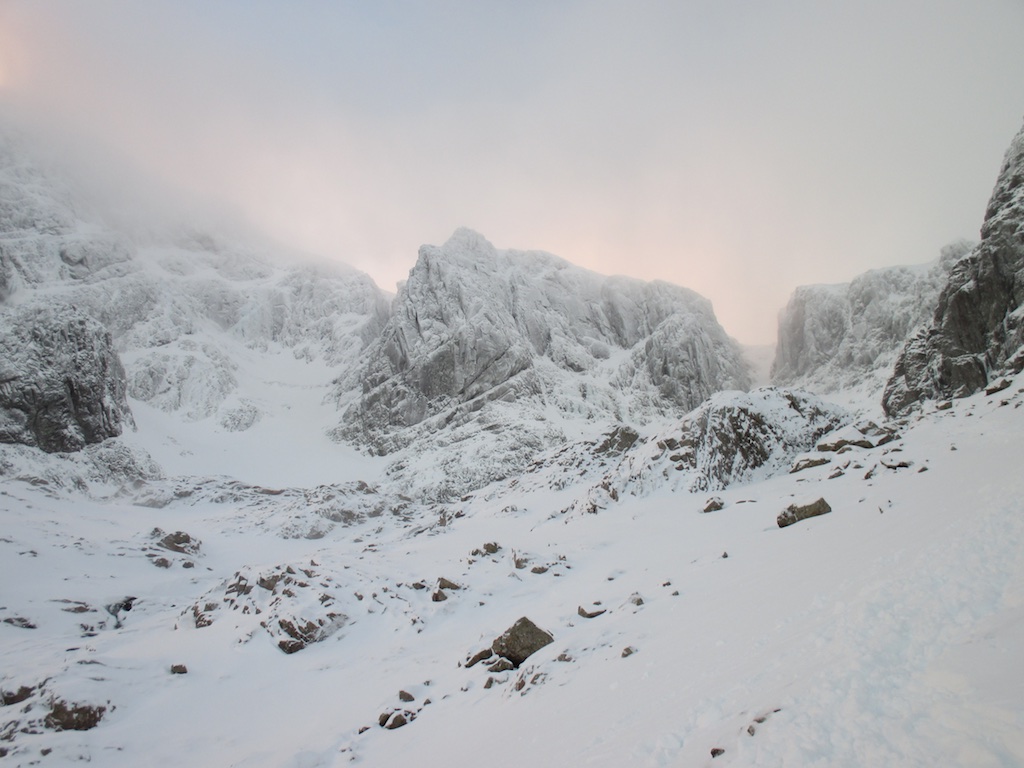 A quick raid on the Ben to make use of the promising forecast saw Rich having a pleasant day soloing Green Gully and returning down Ledge Route. What I hoped to be an early-ish start (5:30 get up and in the car park for 7:15) proved not early enough, only one proper space left in a very keen multi-lingual North Face car park! I overtook a few teams, including a German foursome, on the dark walk-in but there were plenty of people who’d obviously set off earlier and were heading up to routes by the time I arrived at the CIC. I opted for Green Gully as a low stress solo which was in excellent nick with three good ice steps and reasonable nevé, thanks to Tom and Neil for letting me past at the belays.