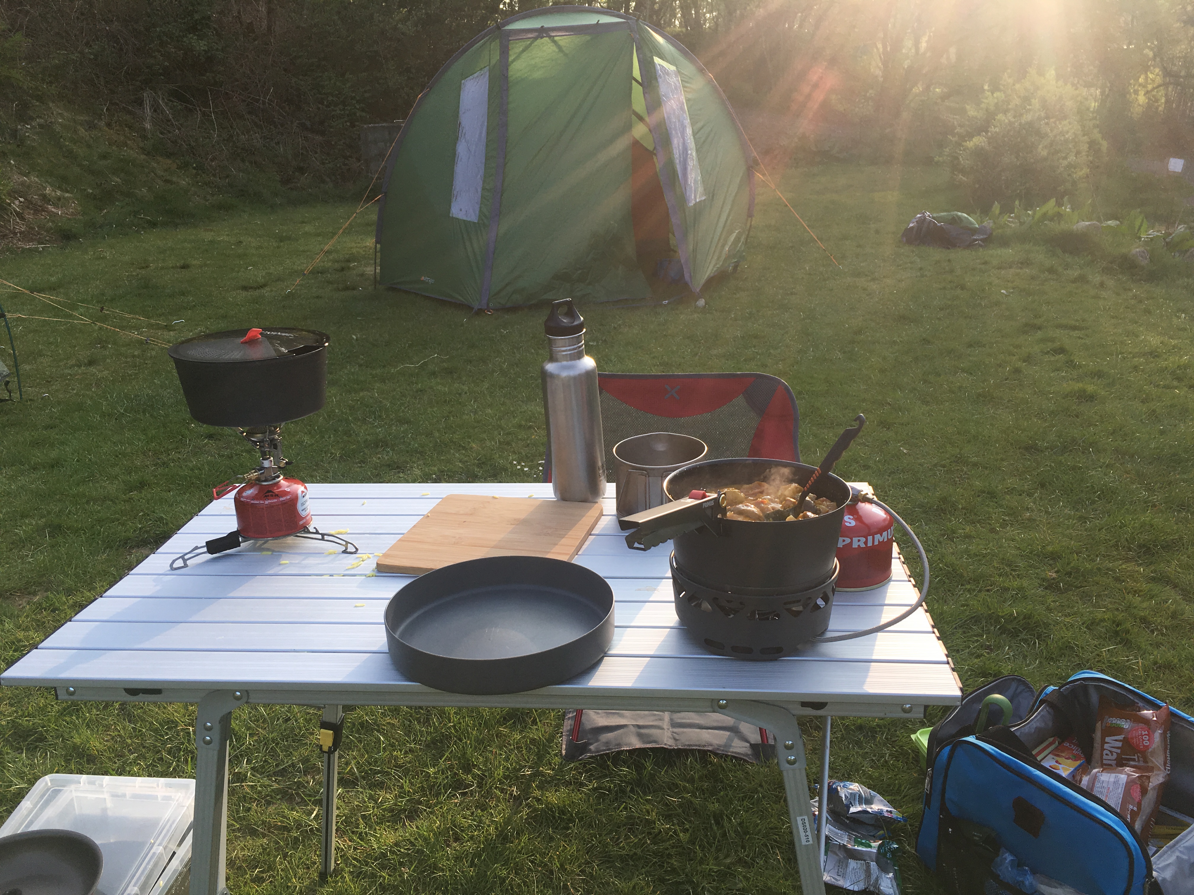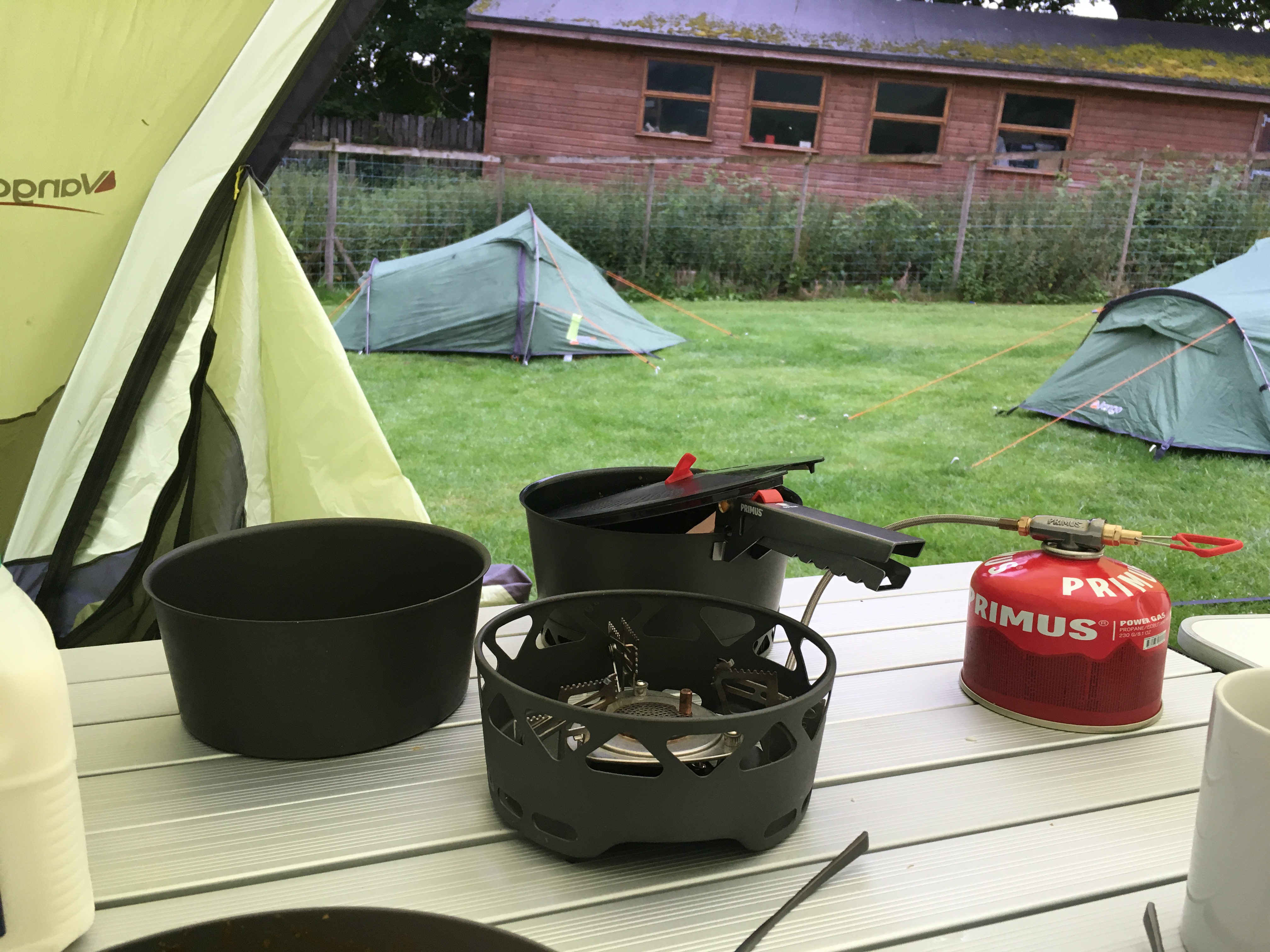 And so to cooking on the Primus PrimeTech stove. The stove tested was a regulated stove, even so I had to almost completely open the valve fully before gas comes through to the burner unit. The flame is lit using the supplied piezo lighter (a very handy bit of kit as it’s separate from the stove) and the flame spread is as good as any stove in the Primus range. There is some basic flame control using the valve but it isn’t as good as a regulated valve so you will need to keep an eye on the flame. Unless you are boiling water (for which there are much more efficient stoves) you will need to have the flame on very low as the pans are aluminium and thin bottomed (this is an issue with all pans in camping sets). If you are not vigilant you will end up with burned food on the bottom of the pan – be warned!