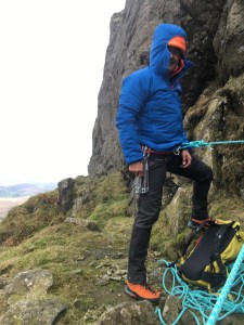 So how does it work? Well the Reversa has 2 sides to it. The plain coloured side is the wind resistant side (which I wore most of the time) and the dual coloured (with the check pattern) is the side for wearing when you are moving fast and for climbing in. That’s it in theory, in practice I found both sides to be too warm for uphill approaches – but then I run quite hot and whatever I’m wearing is wet by the time I’ve reached the route or summit. I rely more on my clothing’s ability to dry out quickly at the beginning of a route or when I’m on the ridge (or even sat down having a brew). I did find a difference (albeit small) between the 2 sides with the dual coloured side drying a little faster that the plain side. But hey – I just want to pull a jacket out of the pack and put it on quickly! There is a tiny label on the bottom left hand side of the jacket that helps you decide which side to use, with a flame on the plain side and a snowflake on the checked side.