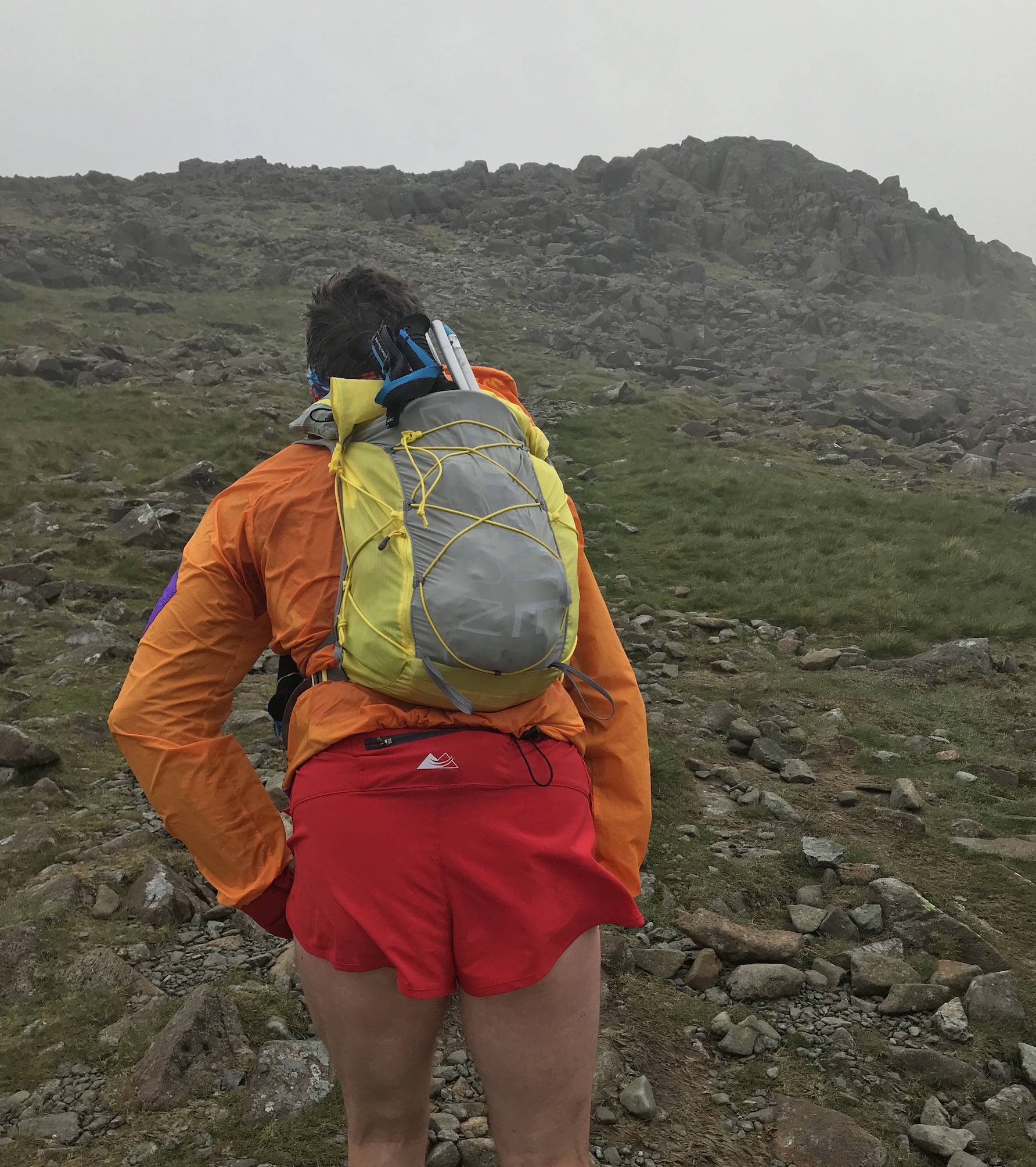 The UD FKT vest was not designed as a race vest and is more a mini pack/vest hybrid. I’ll start with the ‘not so good’ surprises. The lower front stretch stash pockets are very limited – far more so than any other running vest I’ve used and access is made tricky when the bottle (less so if you swap out for a soft flask) and utility pockets are full. I found the Flexform 600 bottle more awkward to drink from than the standard Hydrapak soft bottles, you can just about drink from it without removing (there’s no extension straw option) but it also tends to ‘vacuum’ seal and is not so easy to handle especially in small hands. I managed to ‘cross thread’ the lid three times, allowing leakage, when refilling – now this is obviously user error but I’ve never done that with any other bottle I’ve used so I’m not convinced the design is idiot proof enough for stress-full situations. All this was solved by just swapping in a Hydrapak 600ml softflask. Thankfully the positives far outweigh the problems. The utility pocket is brilliant though it does mean you have to choose between food etc. storage or an extra softflask. Used for storage you can cram loads in there; smartphone, 4 energy bars, gels etc. zip them securely away yet easily access them without fear of dropping anything on the go. UD’s pole holders are the best I’ve used, simple, quick and secure. The tracker/locater beacon pouches are threaded onto webbing straps that fasten via a press stud high on the shoulder straps. I used these mainly for additional food storage – it strikes me that being detachable it would be better to have just the one and ramp up accessible storage at the front by perhaps having another set of stretch pockets. The back of the pack is excellent storage, compression and accessibility work brilliantly. You can carry a bladder in the internal slip pocket to give more liquid capacity (given the front carrying limitations). The main pocket can contain enough for an overnight stay and the outside stretch pocket works fantastically for rapid access to waterproofs – especially if you are acting as a pacer/pack mule for a friend! As I have already mentioned the two part compression retention system snugs everything down superbly.