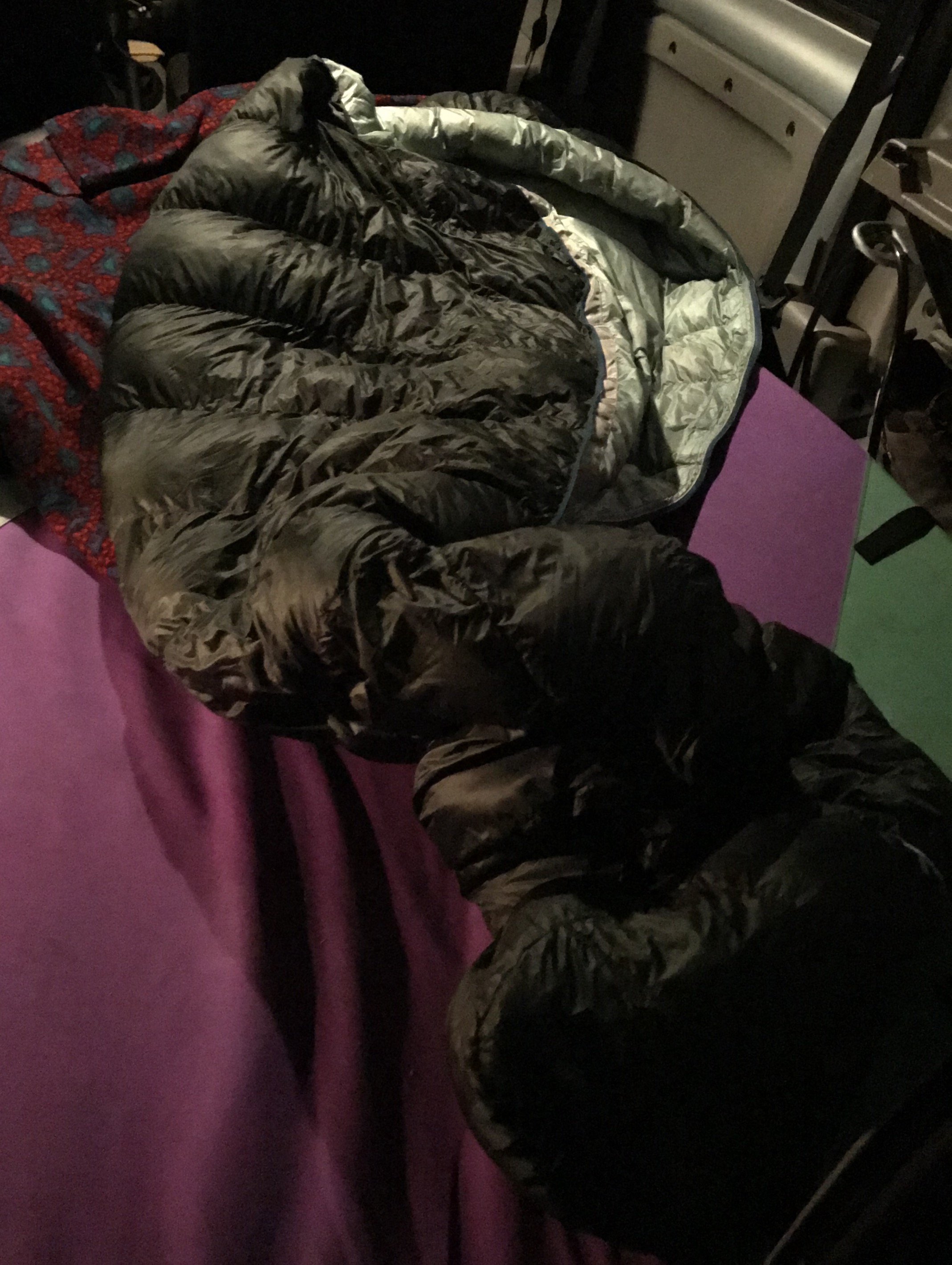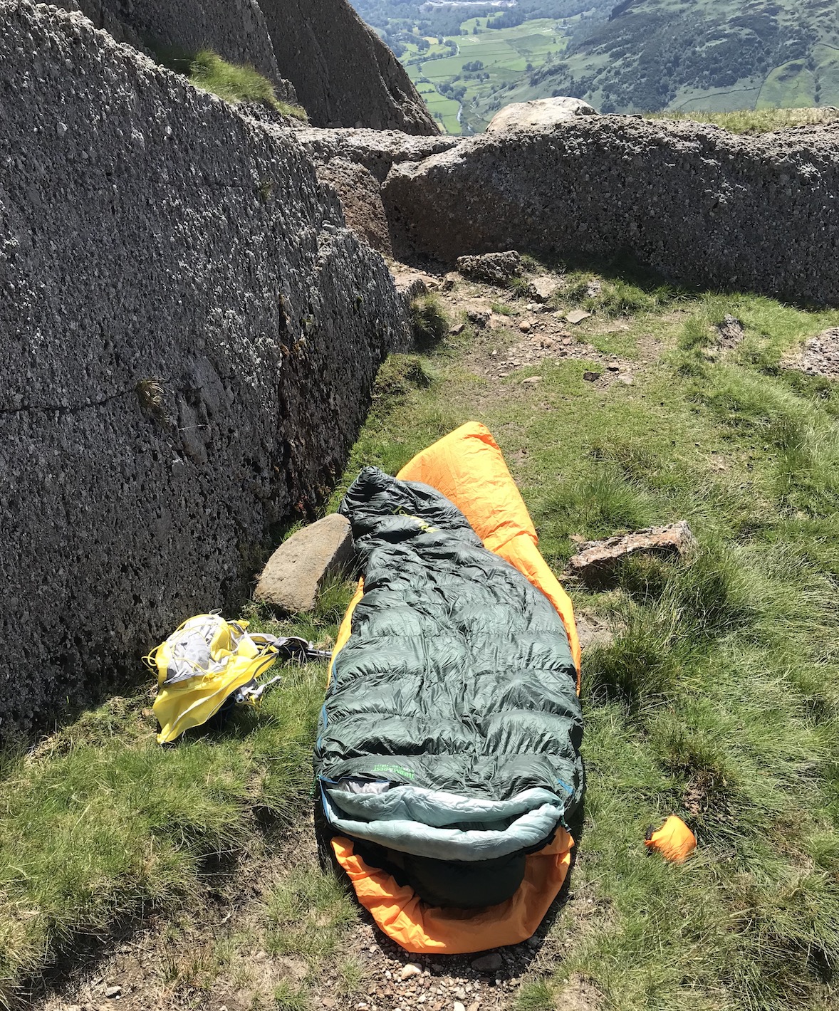 So the Hyperion has a comfort rating of 5°C, a Transition(limit) rating of 0°C and if it gets to -15°C you are in a bit of bother! Less objectively I can say it has kept me comfortable in spring and summer conditions used in the back of the van (waiting to pace runners at ungodly hours of the morning), in various mountain huts and the occasional bivi. Used on successive days in typically damp British conditions I’ve found no loss of loft and I’ve been impressed with how it re-lofts after compression. As I mentioned earlier the cut is more ‘trim’ than many bags but mainly in the leg area so you may want to check the fit if prefer a bit of wiggle room. Having said that I found I could easily sit up and operate a stove etc. Helpfully Thermarest actually publish the dimensions: shoulder 145cm, hip 126cm, foot 109cm these are for the ‘regular’ size. As you would expect of such a light bag the fabric is very lightweight but has so far stood up well. On a rocky bivi I’d be a little concerned about using it uncovered but I always use an ultralight bivi bag anyway (protection plus keeps the sleeping bag clean) so not a major issue. Being so light there is a slight tendancey to snag in the zipper if you are a little industrial with it – there is an anti snag set up but it’s not as effective as some I’ve used. Overall I’ve found it to be a very versatile and reliable sleeping bag for Spring and summer UK use. If you want the ultimate in lightweight 0C bags (especially including a zip) there are very few that can compete. Supplemented with a bit of warm clothing I suspect it will function well on summer alpine bivis with the advantage that it won’t be too warm in the valley – I’ll find out next month!