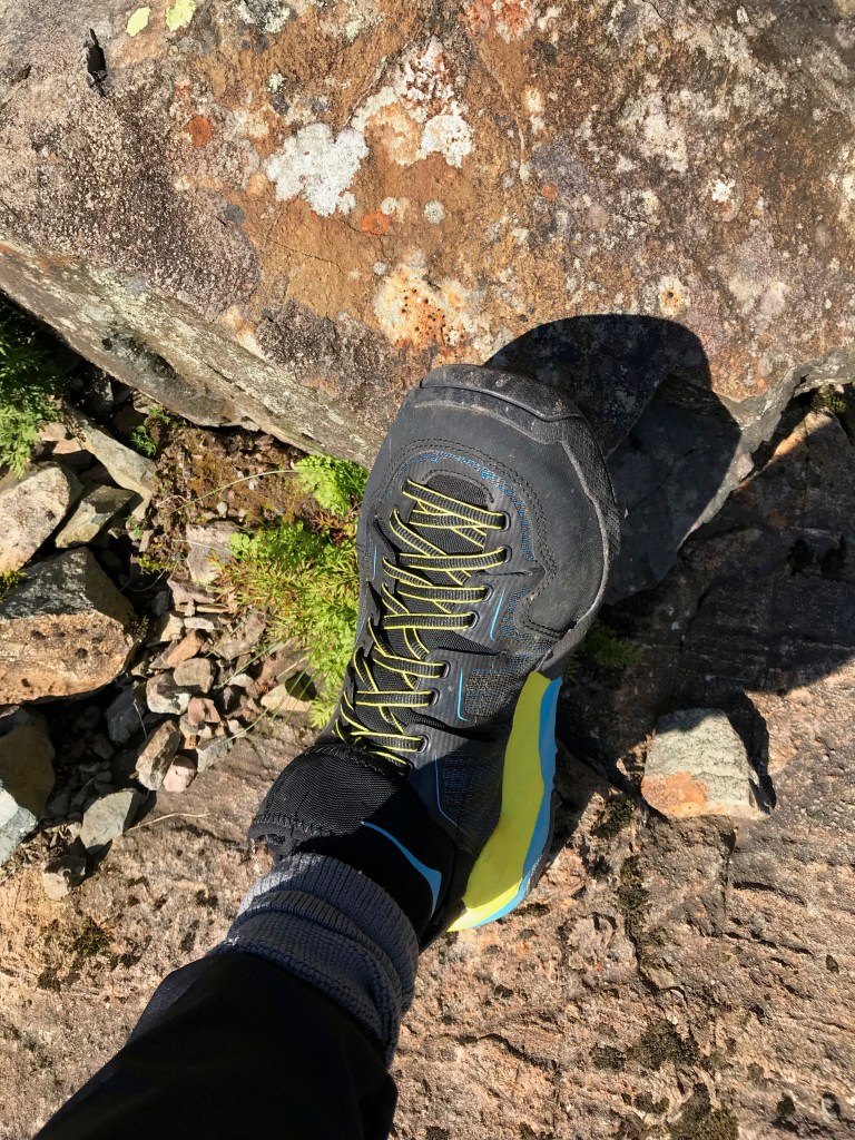 The inner uses perforated neoprene so isn’t waterproof even when you are hiking through wet bracken or undergrowth – in those conditions I would suggest you wear some waterproof socks (although in my experience with the boots in really wet conditions you will still get wet feet). So the Sky Arkali are better suited to cool dry conditions as they also run quite hot because of the neoprene. They have, however, been fine and comfortable in these late season cooler conditions with a thinner pair of socks. You can wear thicker socks as the toe box is a wider fit than the Speedgoats I’ve used in the past.