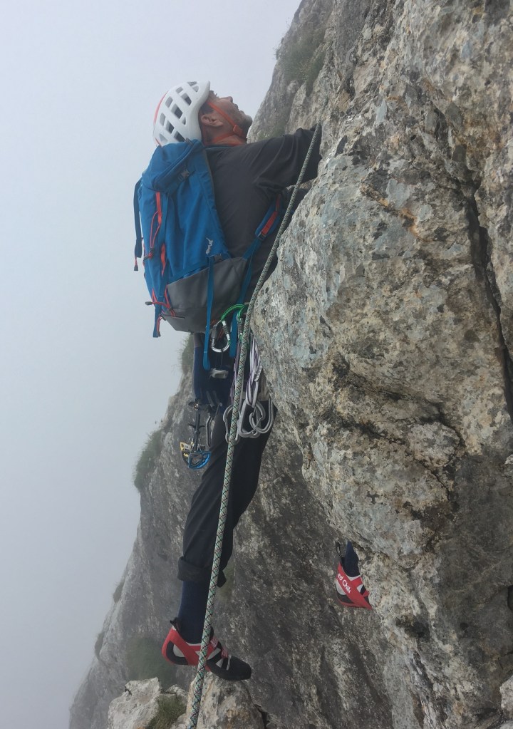 When I first received the Fusions I immediately popped out to my local crag (Almscliff) to see how they fared. I’d adjusted my expectations down a little for the bigger fit but I must admit I felt a little concerned that I’d overdone it by going up half a size. To be honest performance was pretty good and after all these were meant for big routes with swollen feet – not smearing on eliminates. The Fusions are definitely more roomy than the Voltage, I’m pretty sure if I’d sized them the same they would have made for a perfect UK multi-pitch trad fit. Using the Fusion for some multi-pitch trad in the Lakes up to around HVS I found them luxuriously comfy to climb in and equally comfy for short walks back to kit at the base of the route. The wide fit together with sizing up gave the sensation that my feet were ‘rolling’ a little on the smaller holds but I had no slips or issues and I soon got used to the feeling. The virtually flat sole together with the flexible nature of the shoe meant that toe power was lacking compared to a toe down lasted shoe but for smearing and lateral edging there were no issues. Obviousy a tighter performance fit would help at the the toe. Come August it was off to the Alps and as is now common; more rock climbing than anything else. Thirty years ago I climbed on the recently established bolted mountain routes documented in the Piola guide. One incident I shall never forget was climbing Dam du Lac on the south face of the midi in my ‘UK fit’ blue Ballets. A pitch or two shy of the top I remember trying to tear them off my feet without dropping them whilst teetering around on semi hanging stance – the pain being almost unbearable (I’d been trying to edge with my heels for the last few moves!). Though probably only 6 or 8 pitches long the whole south facing in the sun alpine experience meant swollen feet to a degree I’d not experienced before. Lesson learned – or so you’d think! In the intervening years things have gotten better – for one thing rock boots became much more foot shaped but I still found it hard to let go of the whole ‘performance fit’ idea so periodically I’d suffer on the bigger routes. Not this year. With four biggish (10-14pitch) routes in the 6a – 6c range I can report totally comfortable feet. I didn’t need to remove my Fusions at belays and with feet swelling in the heat I found the performance spot on. As a bonus the I could fit a thin sock inside which would come in handy for those chillier climbs. The comfort was a revelation – if you haven’t tried it I can thoroughly recommend it!