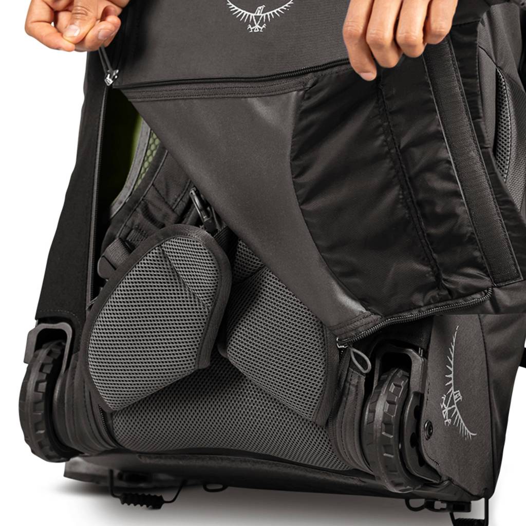 This means that you can use it for more extensive hiking trips, so you you want to travel around Jordan and decide to hike some legs of the Jordan Trail through Petra then you should be able to do that in comfort with the carry system. There are comfortable shoulder straps, a wide hip belt, a sternum strap and two clips to attach an 18L Osprey Daylite pack for more volume should you need it. The carry system is accessed by unzipping a cover (which has a hidden ID slot) just like the other Farpoint packs. The cover also holds the single pole telescopic handle which is easy to deploy and is comfortable to use for towing. One concern we have is that the cover is clipped into two plastic buckles under the wired foot rests, we feel it would be a more robust design to have metal buckles as the underneath of these style of packs takes a lot of the abuse.