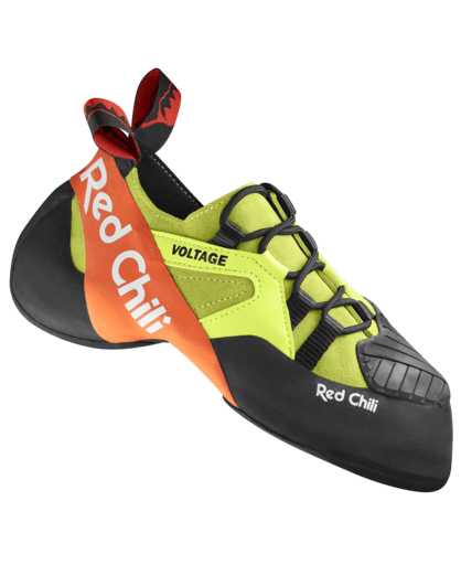 The Voltage Lace uses the bright green (wasabi) and a dash of orange) colour-way of the original Voltage but there the similarity ends. The last is the same as the new Burgundy/Orange Voltage and has been modified a little especially around the heel when compared to the originals. The heel is now a more powerfulI was a little wary of this at first as one of the delightful aspects of the original Voltage was its comfort around the achilles, albeit for some users at the expense of extreme heel hooking performance. Compared to the original Voltage I’ve gone up half a size from an 8 to an 8.5, I physically couldn’t get the 8 on my larger left foot. The heel is definitely more aggressive but it doesn’t exert any undue pressure on the achilles (to which I’m very sensitive) and after a short break in period I’ve been able to wear it for long bouldering and sport climbing sessions but I’ve not tried any serious multi pitch climbs. For heel hooking it is an improvement over the original Voltage – personally I had no issues with the original but I’m aware that some folk did. The last is still a good one for my wide feet which is a relief as there don’t seem to be many companies catering to the Hobbit footed climber! As you would imagine the lace up is not simply the Velcro version with the addition of laces! The shoe is a little stiffer, the upper is a different design and there is a burlier toe patch. The laces allow a more customised fit and very easy entry & exit from the shoe and together with the reinforced tape lace eyelets will mean little or no unwanted stretch though you do get that nice ‘moulded to your foot’ effect with the leather upper. The laces are offset with the leather upper wrapping over in place of a tongue. This arrangement works very well and I had no issues with it whilst it also allows for a larger toe patch for toe hooks and jams. The toe patch seems a bit less sensitive to me indoors though it works well in cracks and on Grit out on the real stuff. My only complaint fit wise is that Red Chili have put a thin fabric liner across the top of the toe box presumably to limit stretch and I found this at times rucks up a little just on the stitch line to dig in to my left pinkie toe. Red Chili state: