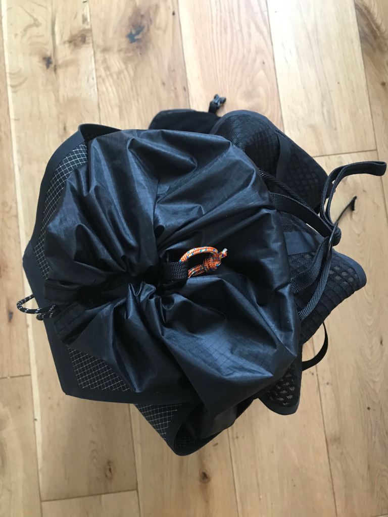 Design wise you get an 8 litre body that will swallow whatever running kit you need, I’ve loaded it with waterproofs, windproof, bivibag, bothy bag, warm Polartec Alpha top, warm gloves, hat, Khatola spikes, ice axe, poles, comfort butties, headlamp, map, compass and first aid kit. Equally I raced the Ring of Steall with just mandatory kit and thanks to the compression cord had no bounce and could barely tell the difference between it and a race vest. In fact the only difference I noticed was a lack of ‘kidney’ zone storage. The pack closes with a draw cord and roll/flap just like the Blitz which is super quick and simple but not fully weathertight so as always if you have water sensitive kit stow it in a drybag. The body fabric of the pack seems very waterproof but water can pool and channel in on top. I would say that the pull tab being black on a black fabric is not the most visible – simply using a bright colour here would help in those stressful/tired scenarios. Inside the body of the pack there is an inner pocket with key clip suitable for wallet/compass/first aid kit etc. and also a hydration sleeve.