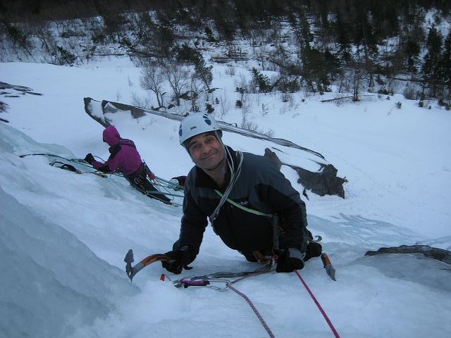 Back in the day – enjoying the warmth of my trusty Rab Vapour Rise Guide jacket ice climbing in Norway.